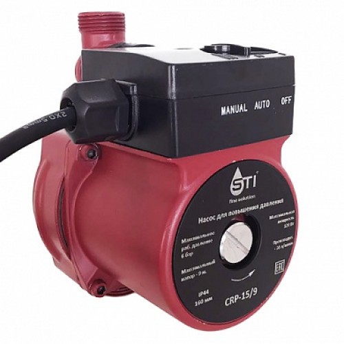 Повысительные насосы STI предназначены для повышения давления в существующей системе водоснабжения. Используются в сети водоснабжения для повышения напора воды в душе или в других точках водоразбора, перед водонагревателями (газовые колонки, проточные водонагреватели, двухконтурные котлы), стиральными и посудомоечными машинами. Комплект поставки: Насос -1 шт.; Резиновая прокладка - 2 шт.; Штуцер с накидной гайкой - 2 шт. (размер в зависимости от модели); Технический паспорт - 1 шт.; Упаковка -1 шт. Описание насоса: Насос состоит из гидравлической части и электродвигателя. Ротор электродвигателя располагается непосредственно в перекачиваемой среде, ротор от статора отделяет гильза из нержавеющей стали. Подшипники смазываются и охлаждаются перекачиваемой жидкостью. У насоса для повышения давления STI 15/9 есть следующие режимы работы: MANUAL - насос работает постоянно, пока включен в розетку;AUTO - насос автоматически запускается/отключается при открытии крана (вентиля); OFF - насос не работает. Обмотки электродвигателя снабжены защитой полного сопротивления. Имеется подключение для заземления наружного корпуса насоса.